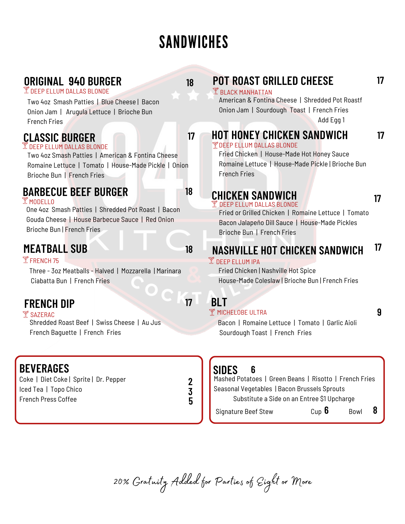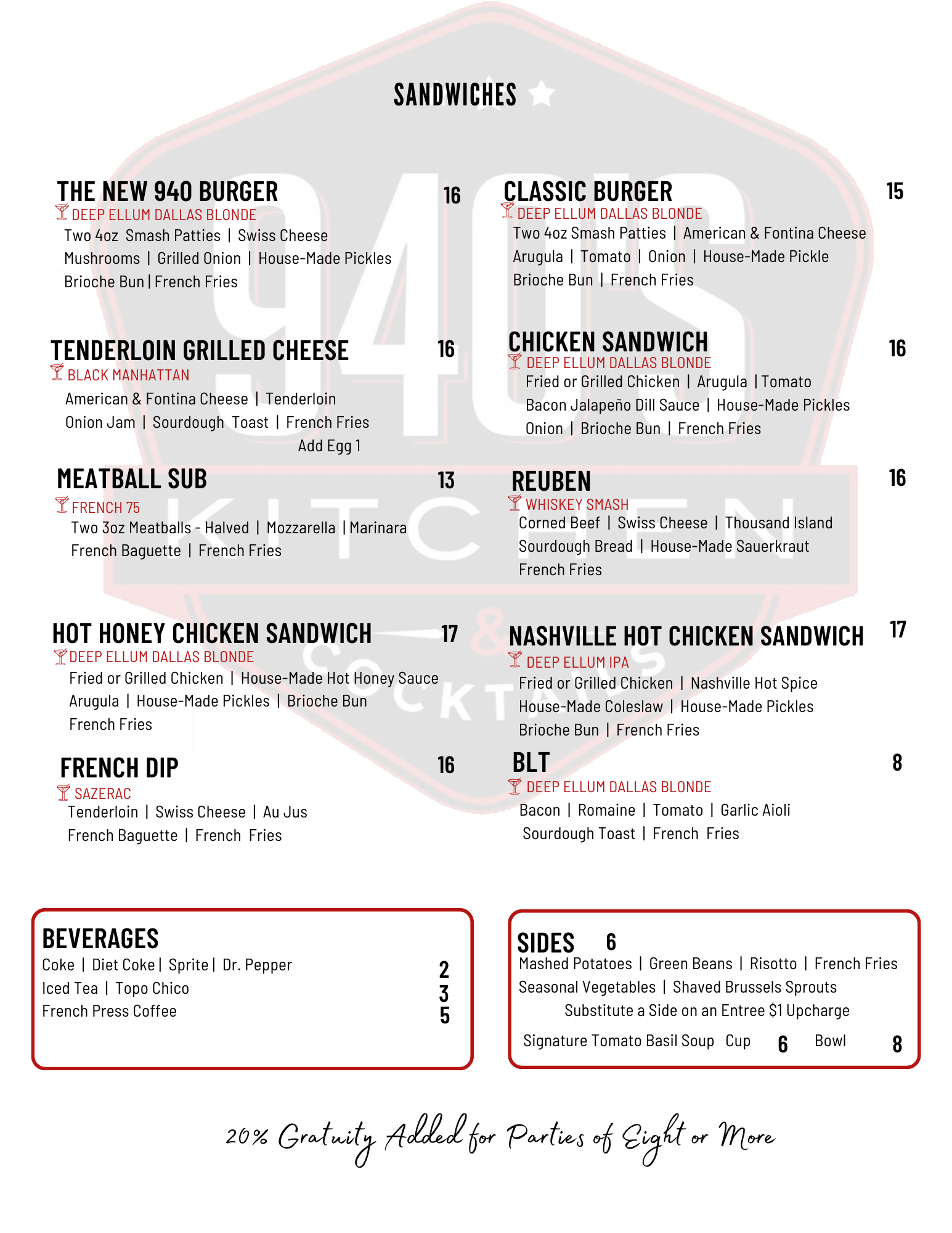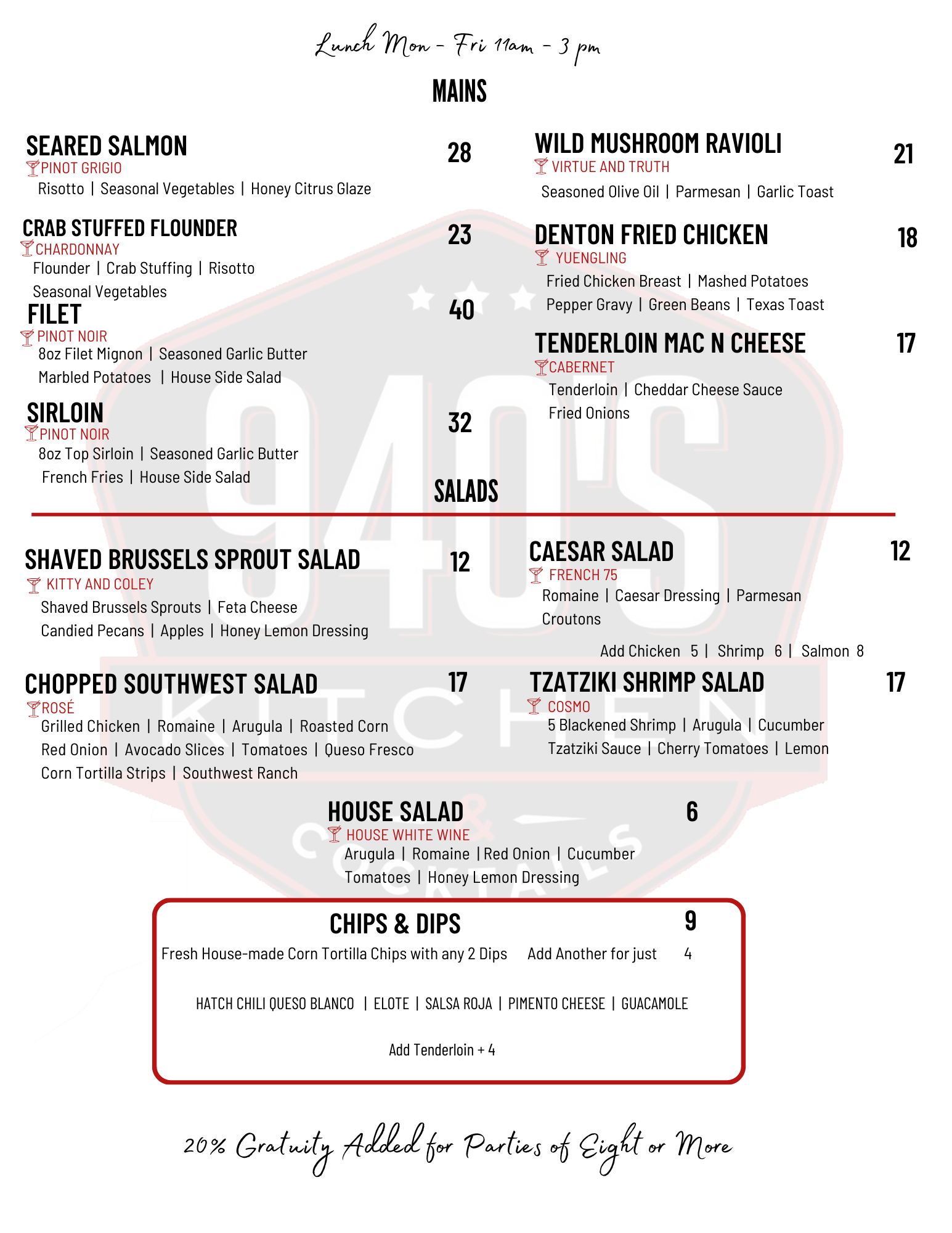 At 940's Kitchen & Cocktails, we know that lunch is the perfect time to indulge in delicious food and good company. Our lunch menu features an enticing array of options, offering everything from light bites to hearty meals, ensuring you find the perfect dish to satisfy your midday cravings. Whether you're looking for a quick meal during your workday or a leisurely lunch with friends, our kitchen and cocktails in Denton provide the ideal setting for a delightful dining experience. Join us for some comfort food in Denton that will leave you refreshed and ready to take on the rest of your day!