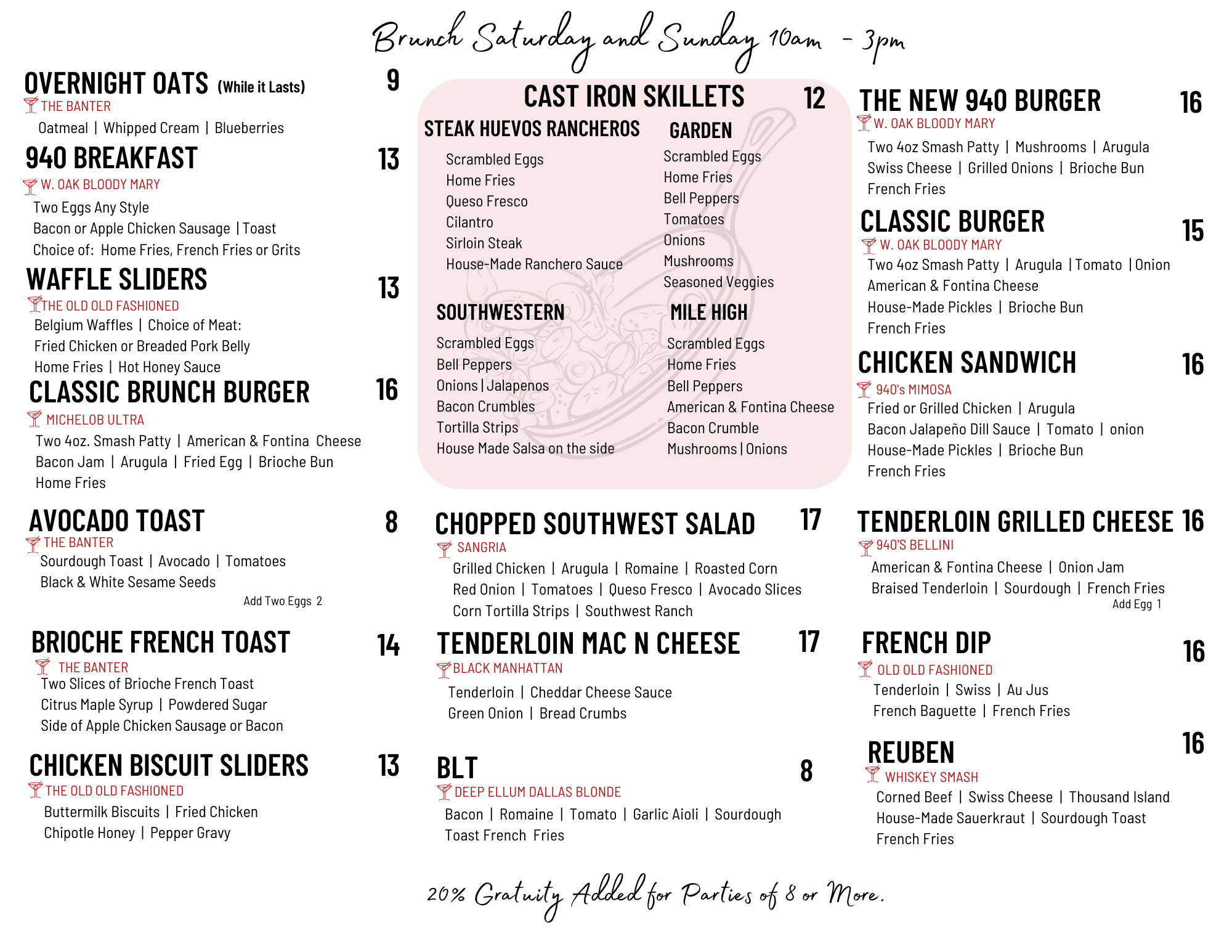 Start your weekends right with brunch at 940's Kitchen & Cocktails! Our brunch menu features a delightful array of dishes that blend traditional breakfast favorites with unique twists. From fluffy pancakes to savory omelets, every item is crafted using fresh ingredients, making it a go-to destination for comfort food in Denton. Perfect for lazy weekends or celebratory gatherings, our brunch is designed to please every palate and pair beautifully with our signature cocktails. Discover why we’re considered one of the best restaurants near you for a relaxing brunch experience with friends and family!